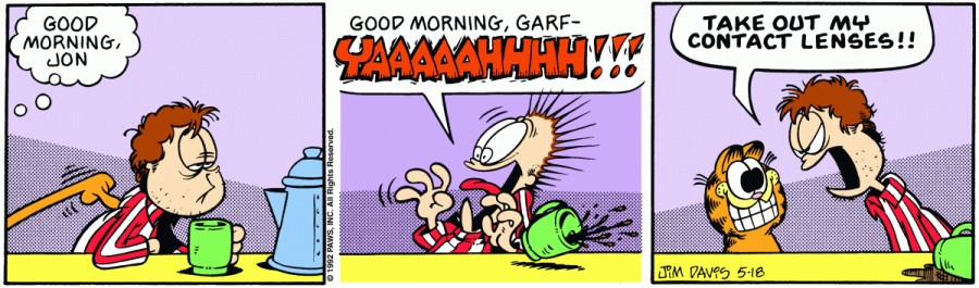 Гарфилд: Доброе утро, Джон Джон: Доброе утро, Гарф - ААААААА! Джон: СНИМИ МОИ КОНТАКТНЫЕ ЛИНЗЫ!!