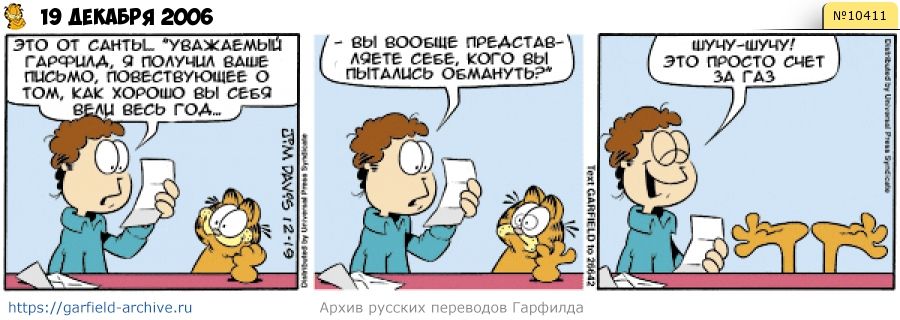 Jon: It's from Santa...«Dear Garfield, I got your letter telling me how good you've been all year... -Who do you think you're trying to kid?» Just kidding! It's the gas bill.