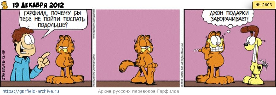 Джон: Гарфилд, не хочешь хорошенько и подооольше вздремнуть? ... Гарфилд: Джон упаковывает подарки!