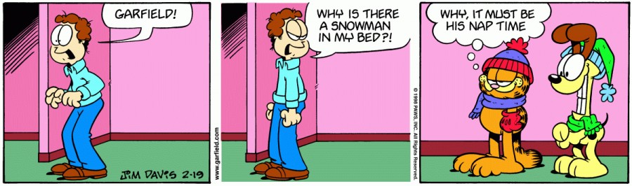 Гарфилд! Почему в моей кровати снеговик?! Должно быть, настало его время вздремнуть