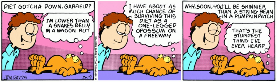 Garfield: I'm lower than a snakes belly in a wagon rut. I have about as much chance of surviving this diet as a one-legged opossum on a freeway.