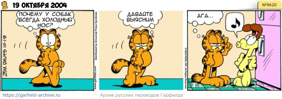 Garfield: Why is a dog's nose so cold? Let's find out. Ah-ha...
