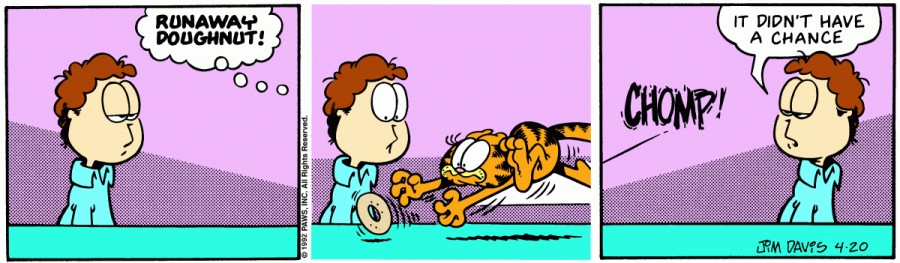 Гарфилд:Бегущий пончик! Джон:У него не было никаких шансов.