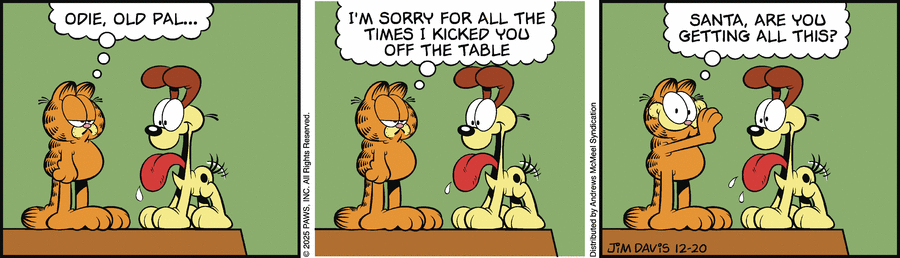 Garfield: Odie, old pal... I'm sorry for all the times I kicked you off the table. Santa, are you getting all this?