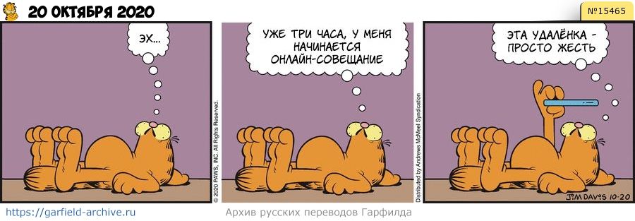 Гарфилд: Эх... Уже три часа, у меня начинается онлайн-совещание. Эта удалёнка - просто жесть