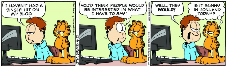 Jon: I haven't had a single hit on my blog. You'd think people would be interested in what I have to say! Well, they WOULD!