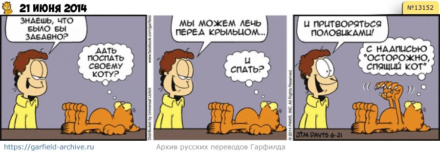 Jon: You know what would be fun? Garfield: Letting your cat sleep? Jon: We could lie on the front porch... Garfield: And sleep? Jon: And pretend that we're doormats! Garfield: That say «Beware of sleep cat».