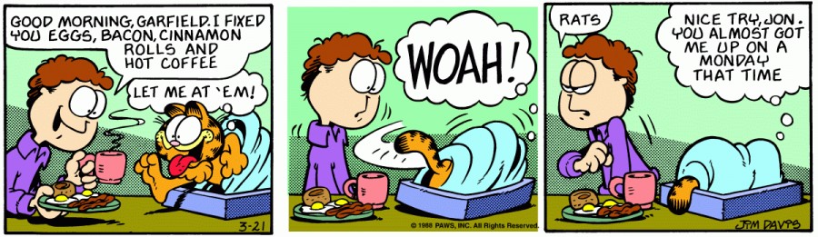 Jon: Goof morning, Garfield. I fixed you eggs, bacon, cinnamon rolls and hot coffee.