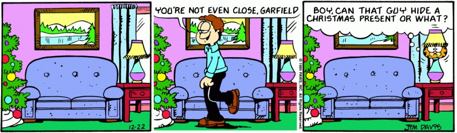 Garfield: Boy, can that guy hide a Christmas present or what?