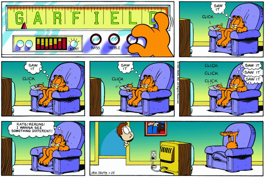 Garfield: Saw it. Saw it. Saw it. Rats! Reruns! I wanna see something different!