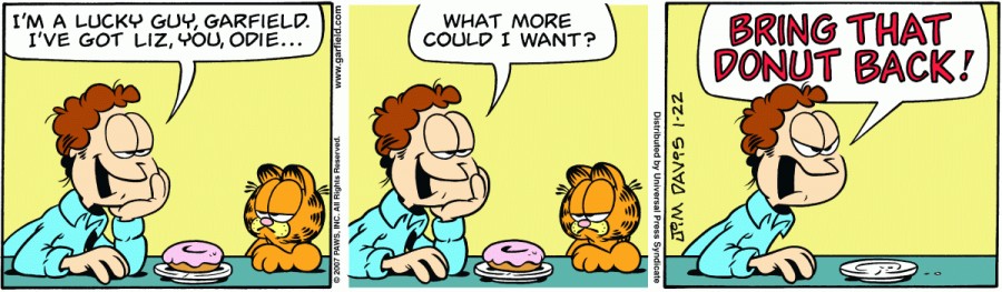 Jon: I'm a lucky guy, Garfield. I've got Liz, you, Odie... What more could I want? BRING THAT DONUT BACK!
