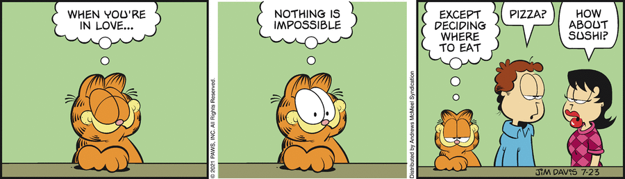 Garfield: When you're in love... Nothing is impossible. Except deciding where to eat