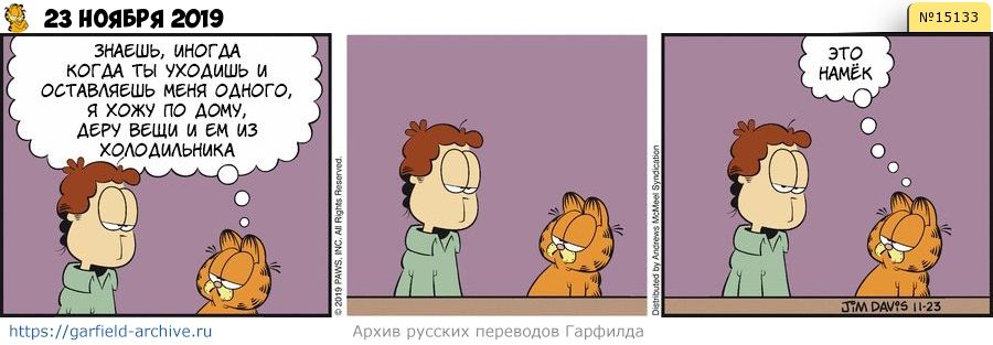Гарфилд: Знаешь, иногда когда ты уходишь и оставляешь меня одного, я хожу по дому, деру вещи и ем из холодильника. Это намёк