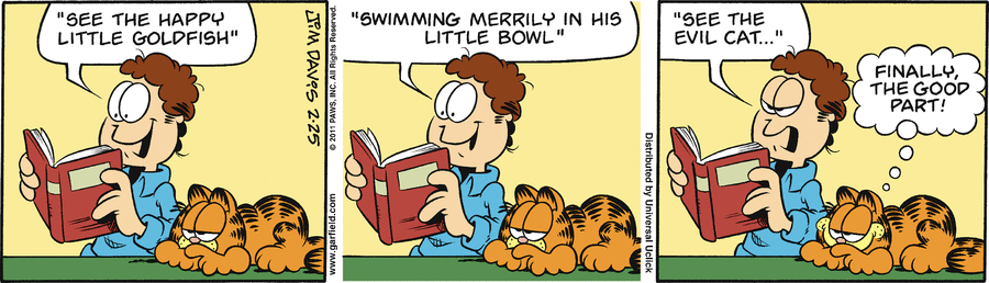 Jon: «See the happy little goldfish». «Swimming merrily in his little bowl». «See the evil cat...»