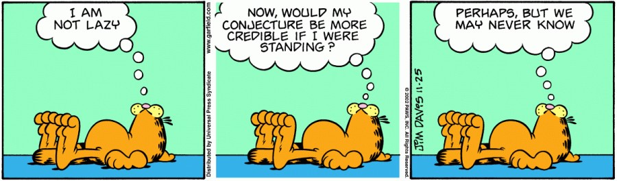 Garfield: I am not lazy. Now, would my conjecture be more credible if I were standing? Perhaps, but we may never know.