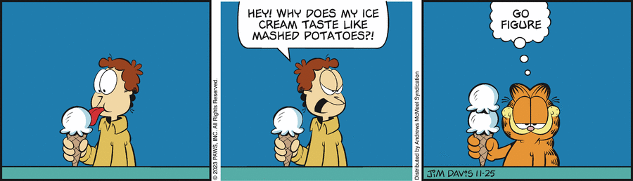 Джон: Эй! Почему мороженое на вкус как картофельное пюре?! Гарфилд: Кто ж знает...