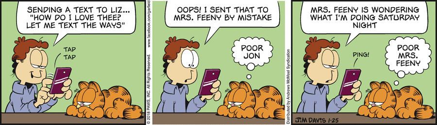 Jon: Sending a text to Liz... *tap tap* «How do I love thee? Let me text the ways» Oops! I send that to mrs. Feeny by mistake