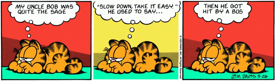 Garfield: My uncle Bob was quite the sage. «Slow down, take it easy.» he used to say... Then he got hit by a bus.