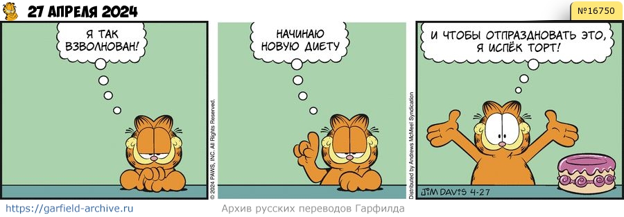 Гарфилд: Я так взволнован! Начинаю новую диету. И чтобы отпраздновать это, я испёк торт!