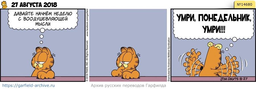Гарфилд: Давайте начнём неделю с воодушевляющей мысли. УМРИ, ПОНЕДЕЛЬНИК, УМРИ!!!