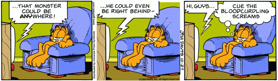 TV: ...That monster could be ANYwhere! ...He could even be right behind- Hi, guys...