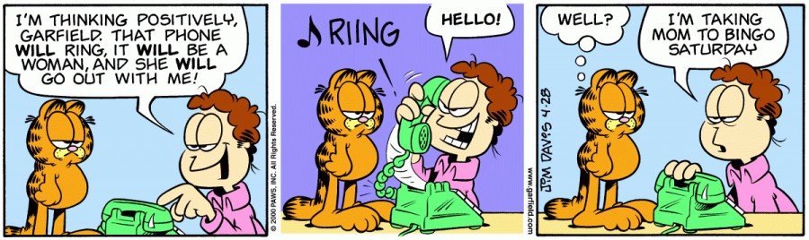 John: I'm thinking positively, Garfield. That phone will ring, It will be a woman, and she will go out with me!