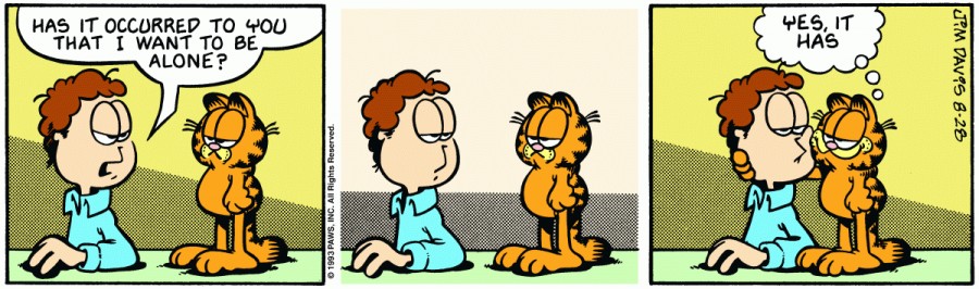 Джон:Тебе не приходило в голову, что я хочу побыть один? Гарфилд: Да, это так.