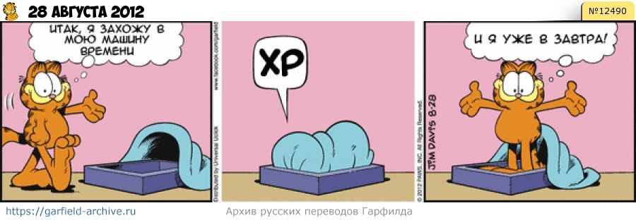 Гарфилд: Сейчас я войду в мою машину времени. Гарфилд: ХР Гарфилд: И, надо же, завтра уже наступило!