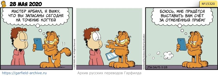 Гарфилд: Мистер Арбакл, я вижу, что вы записаны сегодня на точение когтей. Боюсь, мне придётся выставить вам счёт за отменённый приём!