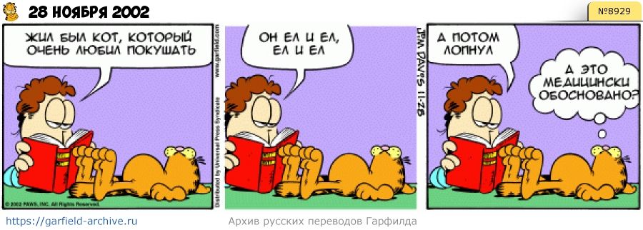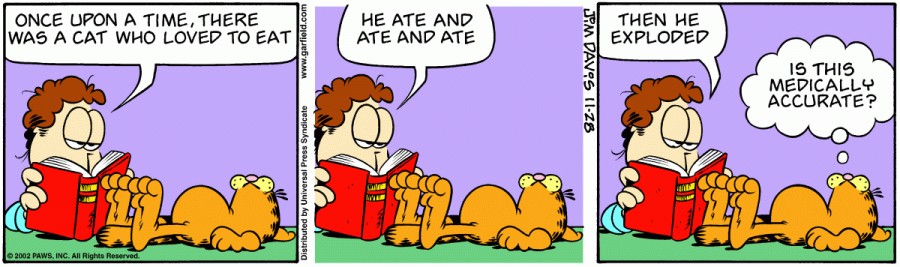 Jon: Once upon a time, there was a cat who loved to eat. He ate and ate and ate. Then he exploded.