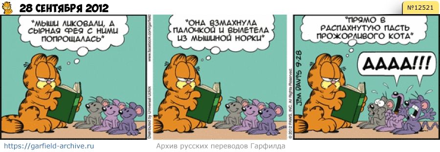 Garfield: «The mice cheered as the cheese fairy said goodbye.» «With a wave of her wand, she flew out of the mousehole.» «Right into the gaping jaws of a ravenous cat.»