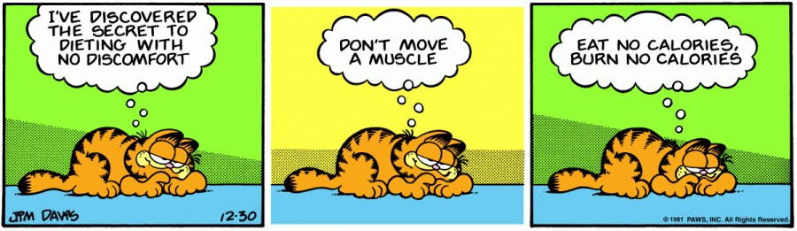 Garfield: I've discovered the secret to dieting with no discomfort. Don't move a muscle. Eat no calories, burn no calories.