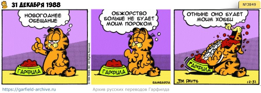 Garfield: A New Year's resolution. Eating will no longer be a vice of mine. Henceforth, it will be a hobby.