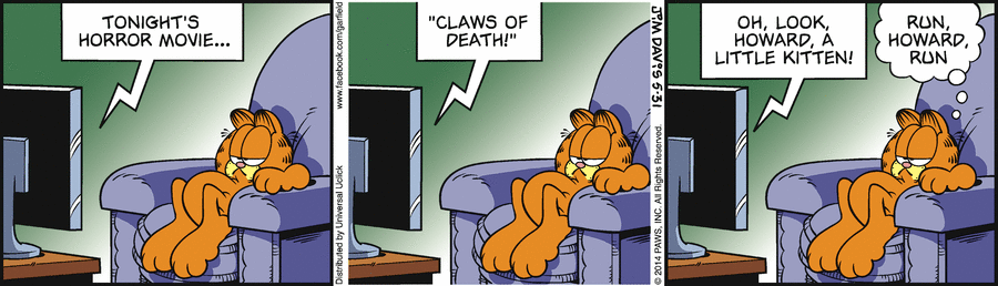 TV: Tonight's horror movie... TV: «Claws Of Death!» TV: Oh, look, Howard, a little kitten! Garfield: Run, Howard, run.