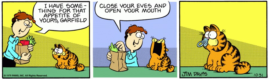 Jon: I have something for that appetite of yours, Garfield. Close your eyes and open your mouth.